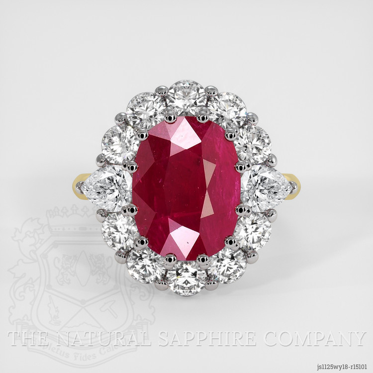 There is a lineage to gemstones that reaches back through empires and courtly salons, a tradition that esteems color and story as much as carat and cut. This ring, presented by The Natural Ruby Company, is a modern heirloom that channels that lasting legacy, centered on a transparent 3.94 carat oval pinkish red ruby from Mozambique, with dimensions of 11.83 by 8.91 by 4.05 millimeters and a mixed brilliant cut. The ruby displays intense color saturation and an excellent polish that catch light with the same dramatic warmth that has long made rubies the jewel of kings. Evaluated at eye level, the stone carries an included clarity grade, a detail that speaks to the gemological truth that fine rubies often bear internal characteristics, inclusions that record the stone's growth and geological history, rather than detract from its nobility. This example has been heat treated, a time honored enhancement that deepens hue and clarity while preserving the natural origin, a practice widely accepted among connoisseurs and gem cutters who seek to reveal each stone's finest expression.