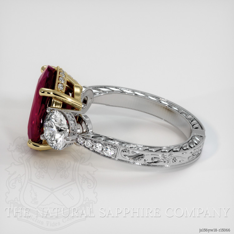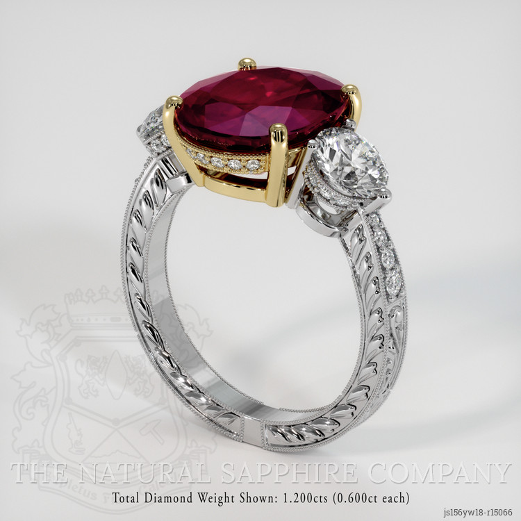 The surrounding white round natural diamonds total approximately one point two zero carats for the primary side stones, clarity grades Very Slightly Included, VS1 and VS2, color grade E, together with additional accent diamonds of approximately zero point zero nine carats and zero point two four carats, clarity VS, color grade F to G, these quality diamonds provide brilliant contrast and a clean, near colorless backdrop that enhances the ruby hue without competing with it. The mounting uses both 18K yellow gold and 18K white gold, the yellow gold prongs accentuate the warm pinkish red of the ruby, while the white gold shoulders and engraved band allow the diamonds to display crisp white light. This design reads beautifully as a single statement ring, standing alone as an elegant solitaire with substantial presence, and it also pairs exceptionally well with additional bands, thin white gold or yellow gold stacking rings will layer without obscuring the ruby profile, the low to moderate gallery and secure prong setting make it suitable for stacking, and the dual tone metalwork offers versatile styling options. This piece from The Natural Ruby Company is crafted for collectors and connoisseurs seeking a highly colored, well proportioned ruby with fine diamond complements, presented with transparent grading and origin information.