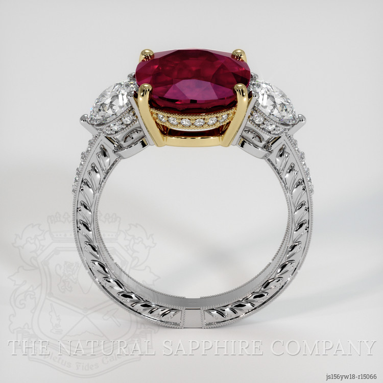 This ring centers on a transparent 5.61 carat oval pinkish red ruby, measuring 11.95 x 9.83 x 5.61 mm, cut in a mixed brilliant style to maximize scintillation and face up color, clarity graded as included, evaluated at eye level, with intense color saturation and an excellent polish, heat treatment has been applied, origin Mozambique. For an educated buyer the combination of weight, transparency, and strong saturation is significant, five carats plus in a single ruby of Mozambique origin is rare and desirable, the mixed brilliant cut balances depth and table size to allow both flash and rich body color, polish at an excellent level ensures light returns cleanly from the facets. Included clarity at eye level means internal characteristics are present and visible to a trained eye in certain lighting, this is typical for natural rubies of substantial size, and the disclosed heat treatment is a standard enhancement used to stabilize and intensify color, a transparent, well cut ruby from Mozambique with these proportions represents both aesthetic impact and investment grade appeal, The Natural Ruby Company ensures full disclosure of treatments and sourcing so you may evaluate this gem with confidence.