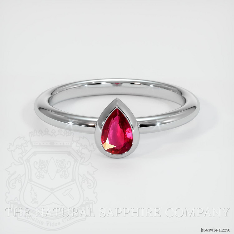 The ring features a beautiful, transparent 0.38 carat pear shape pinkish red ruby with the dimensions of 5.92 x 4.15 x 1.89 mm and a mixed brilliant cut. It has a clarity grade of very slightly included (evaluated at eye level), vivid color saturation, and an excellent polish. The origin of this ruby is Burma (Myanmar).