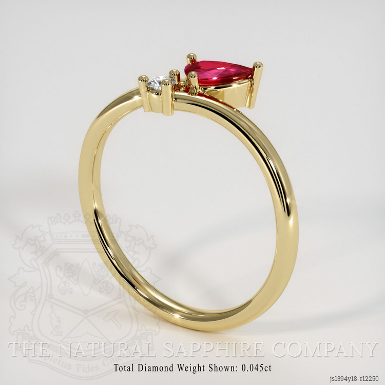 In the gentle glow of twilight, where dreams linger and hearts whisper, there rests a ring of unparalleled beauty. The centerpiece, a pear-shaped pinkish red ruby, catches the light in a cascade of shimmering hues, each facet a doorway to a world of romance. Its transparent depths, spanning 5.92 x 4.15 x 1.89 mm, cradle the dreams of lovers past and present. The ruby, born in the mystic land of Burma, carries with it the tales of ancient passions. Its vivid color radiates a warmth that envelopes the soul, enhanced perfectly by its mixed brilliant cut.
