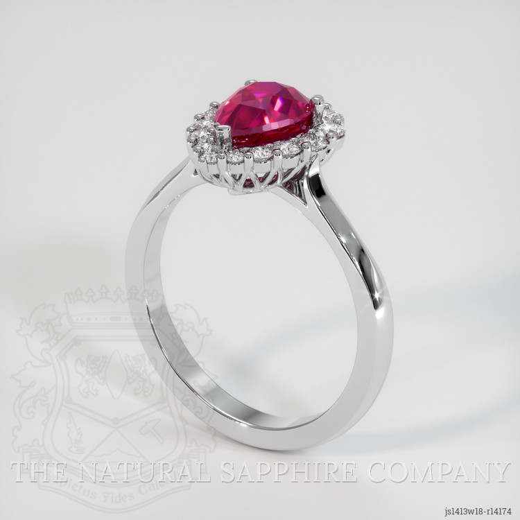 Crafted meticulously, this ruby is set as the crowning jewel in a ring designed by The Natural Ruby Company. Its clarity, very slightly included to the discerning eye, allows it to reflect light with a brilliance comparable to the vibrant sunsets of its homeland. Surrounding this gem, a delicate halo of round white diamonds amplifies its regal elegance. These diamonds, with clarity grades of VS1/VS2 and a color grade of F, range from weights of 0.06 to 0.09 carats. They are meticulously selected to complement the centerpiece, adding layers of dazzling wonder.