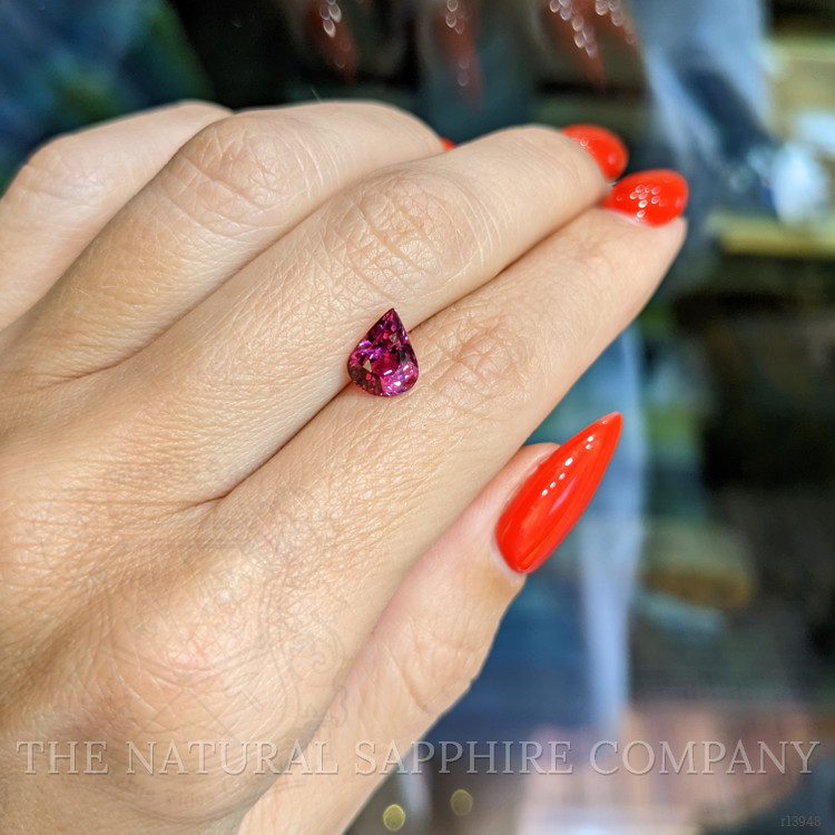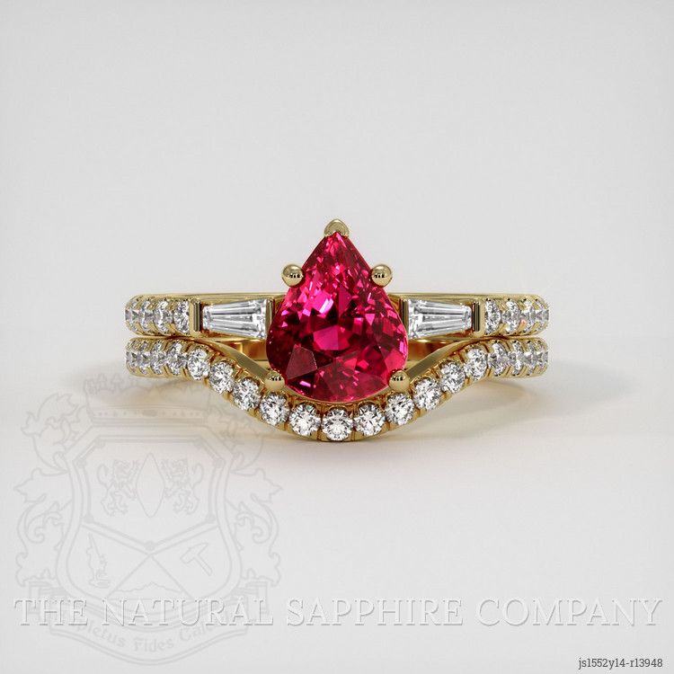 In the heart of this enchanting masterpiece, a pear-shaped pinkish-red ruby, weighing 2.01 carats, rests in a radiant embrace. Gifted with a mixed brilliant cut, it reflects an extraordinary dance of light and brilliance. Each facet seems to capture and release droplets of the sun’s finest rays, creating a spectacle that mesmerizes the soul. The ruby’s dimensions, elegantly crafted at 8.54 by 6.91 by 4.99 millimeters, enhance its transparent allure, as its eye-clean clarity allows one to peer deeply into its vivid soul. Sourced from the renowned grounds of Mozambique, this gemstone brings with it whispers of ancient lands and legends untold.