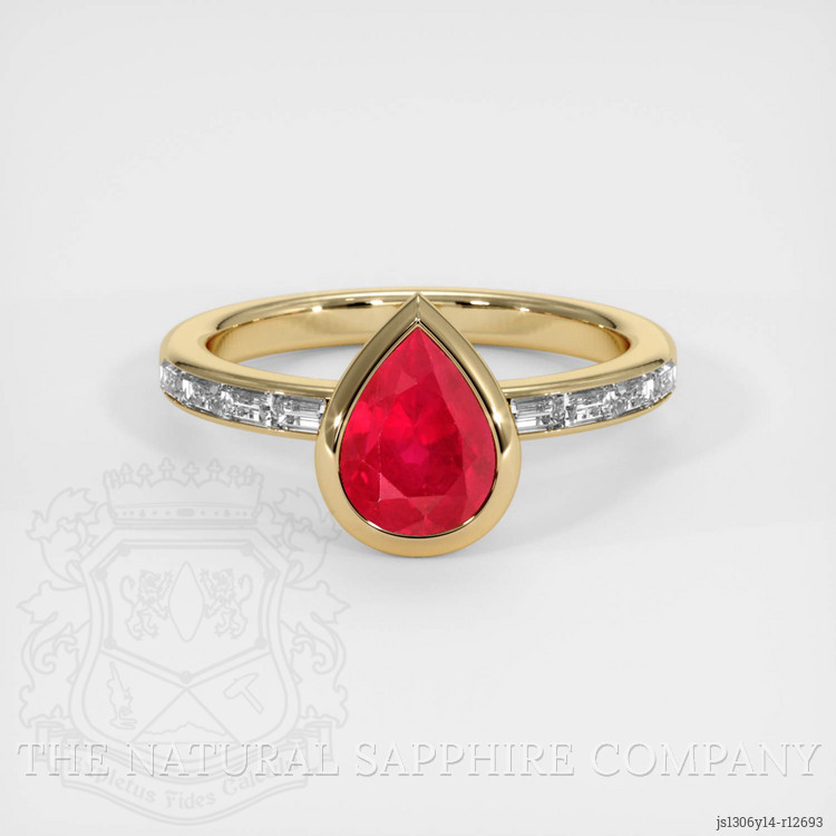 The ring features a beautiful, transparent 2.03 carat pear shape pinkish red ruby with the dimensions of 8.61 x 6.30 x 5.19 mm and a mixed brilliant cut. It has a clarity grade of very slightly included (evaluated at eye level), vivid color saturation, and an excellent polish. The origin of this ruby is Thailand (Siam).