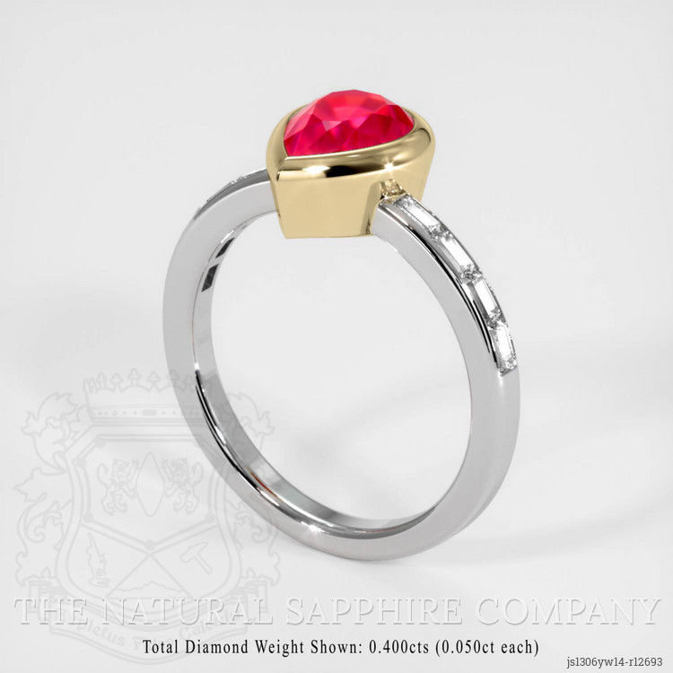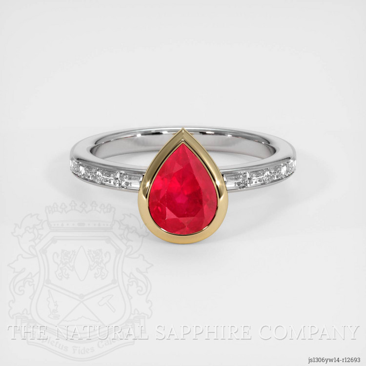 The ring features a beautiful, transparent 2.03 carat pear shape pinkish red ruby with the dimensions of 8.61 x 6.30 x 5.19 mm and a mixed brilliant cut. It has a clarity grade of very slightly included (evaluated at eye level), vivid color saturation, and an excellent polish. The origin of this ruby is Thailand (Siam).