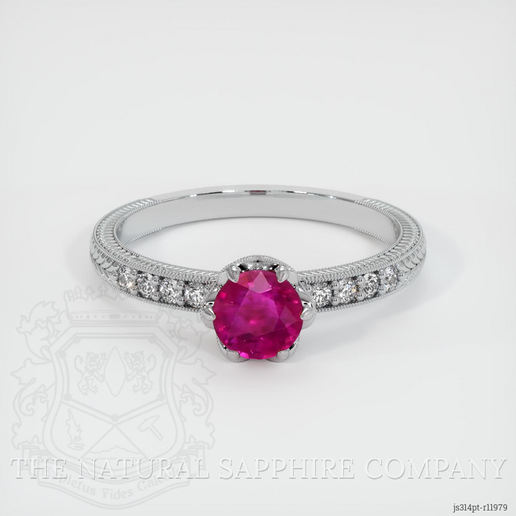 The ring features a beautiful, transparent 0.68 carat round shape pinkish red ruby with the dimensions of 5.16 x 5.09 x 3.26 mm and a mixed brilliant cut. It has a clarity grade of very slightly included (evaluated at eye level), vivid color saturation, and an excellent polish. The origin of this ruby is Burma (Myanmar).