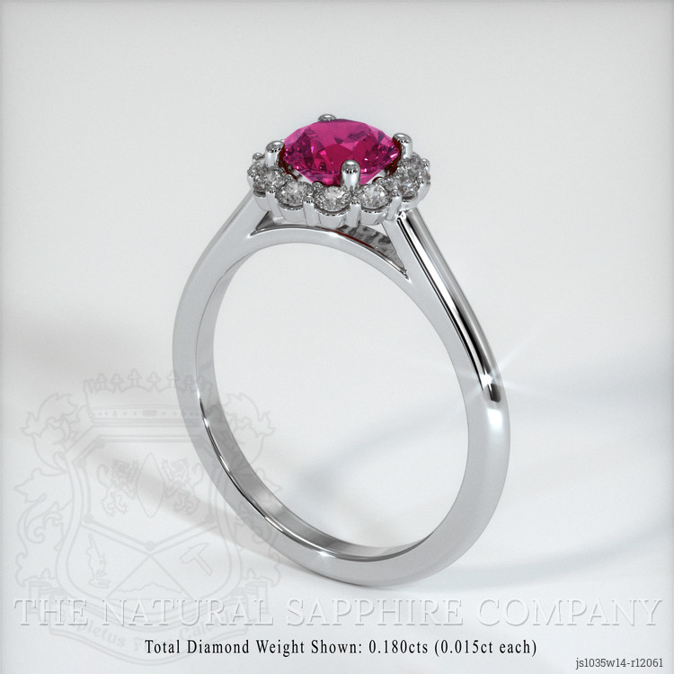 The ring features a beautiful, transparent 0.70 carat round shape pinkish red ruby with the dimensions of 5.31 x 5.24 x 3.19 mm and a mixed brilliant cut. It has a clarity grade of very slightly included (evaluated at eye level), vivid color saturation, and an excellent polish. The origin of this ruby is Burma (Myanmar).