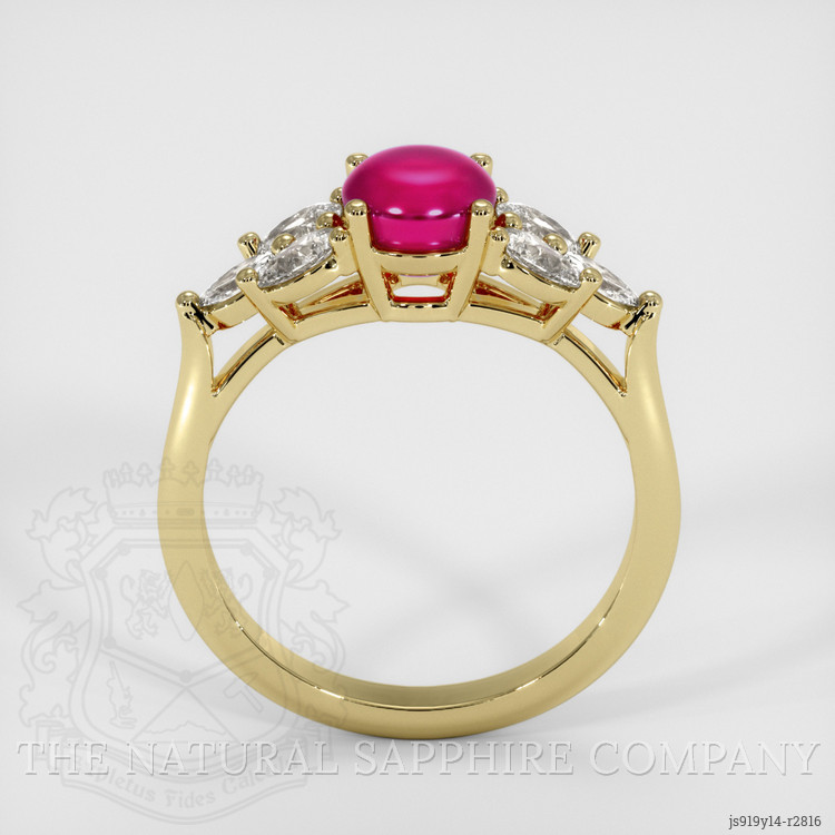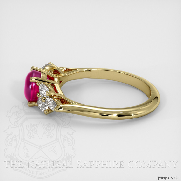 The ring features a beautiful, translucent 1.69 carat round shape pinkish red ruby with the dimensions of 5.80 x 5.82 x 4.33 mm and a cabochon cut. It has a clarity grade of very slightly included (evaluated at eye level), vivid color saturation, and an excellent polish. The origin of this ruby is Burma (Myanmar).