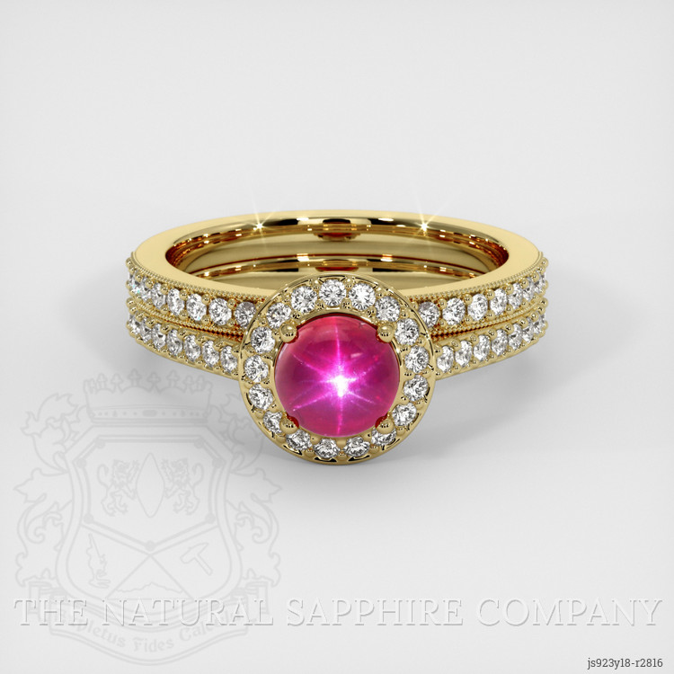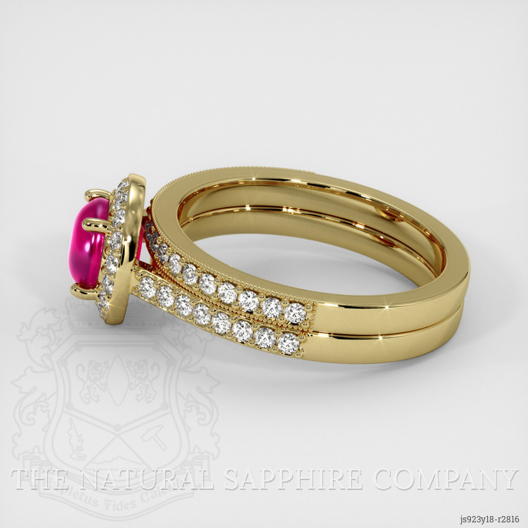 The ring features a beautiful, translucent 1.69 carat round shape pinkish red ruby with the dimensions of 5.80 x 5.82 x 4.33 mm and a cabochon cut. It has a clarity grade of very slightly included (evaluated at eye level), vivid color saturation, and an excellent polish. The origin of this ruby is Burma (Myanmar).