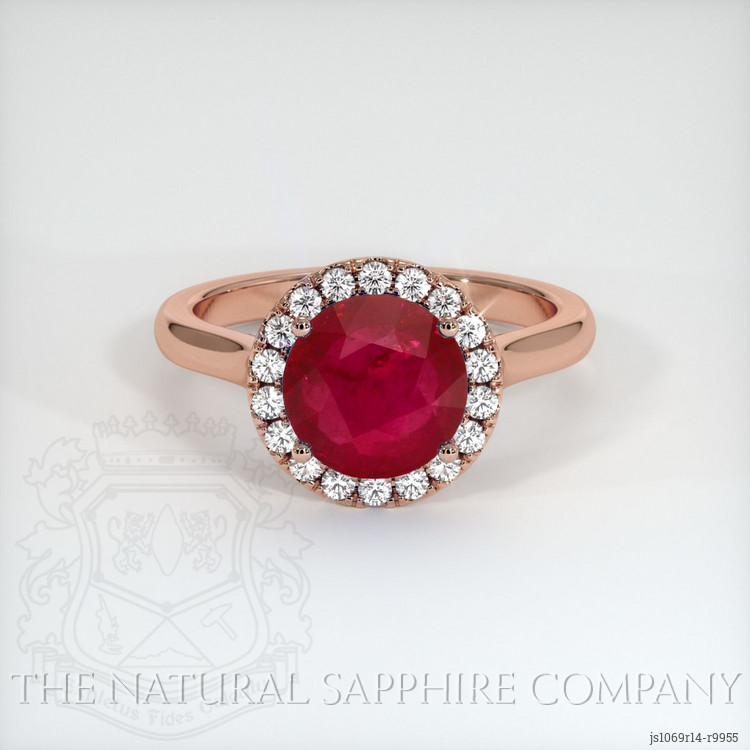 The ring features a beautiful, transparent 2.76 carat round shape pinkish red ruby with the dimensions of 8.13 x 8.07 x 4.43 mm and a mixed brilliant cut. It has a clarity grade of slightly included (evaluated at eye level), vivid color saturation, and an excellent polish. The origin of this ruby is Mozambique.