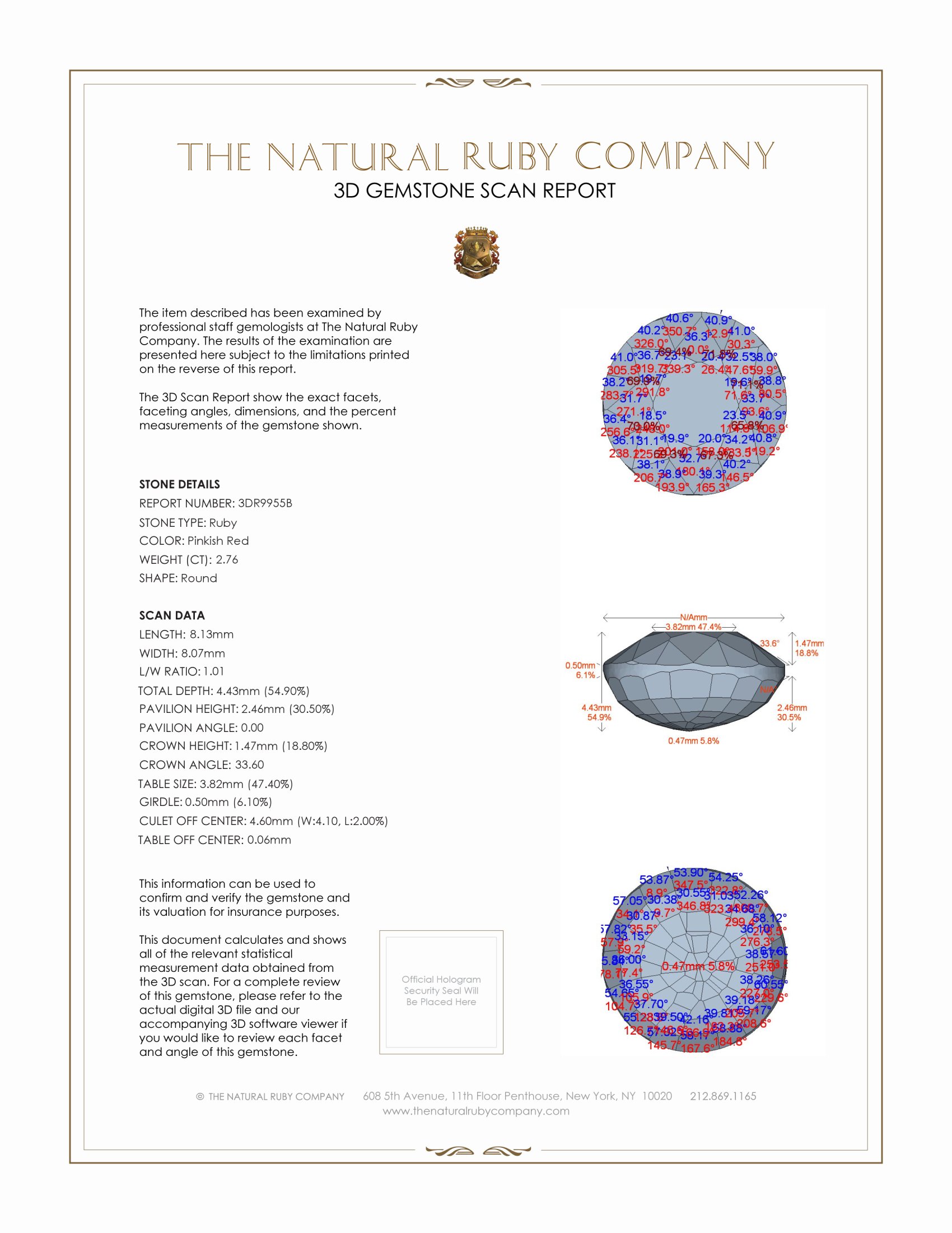 Introducing an exquisite masterpiece from The Natural Ruby Company, a ring that embodies the perfect blend of luxury, rarity, and timeless elegance. This captivating piece features a stunning 2.76 carat pinkish-red ruby, meticulously shaped into a round silhouette with dimensions of 8.13 x 8.07 x 4.43 mm. Its mixed brilliant cut enhances the gem's inherent beauty, allowing it to radiate an alluring sparkle that captures and holds the gaze. Originating from the legendary ruby mines of Mozambique, this ruby boasts a vivid color saturation that is both vibrant and sophisticated. Its clarity grade, slightly included when assessed at eye level, ensures that the gemstone is uniquely characterful yet maintains an appearance of near flawlessness.