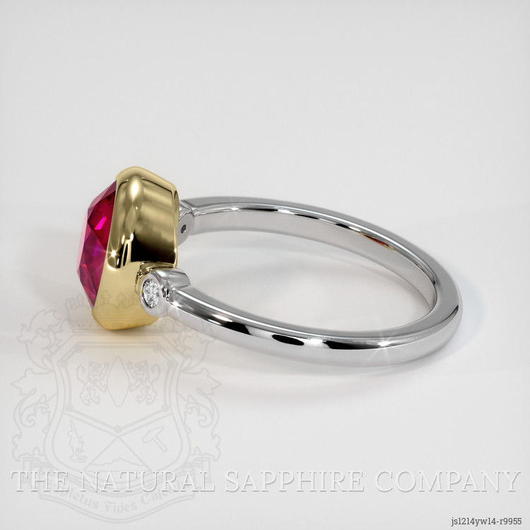 The ruby's captivating charm is complimented by the glow of two delicate, round white diamonds. Weighing approximately 0.04 carats, these diamonds offer a clarity grade of Very Slightly Included (VS1, VS2), with a color grade of F. Their pristine nature enhances the ruby’s flamboyant allure, bringing a sublime harmony to this timeless piece. Set entirely in the luxurious embrace of 18K yellow gold and white gold, the ring becomes a magical fusion of color and light, resonating with an exuberance that feels almost alive. This combination makes it a distinctive choice for anyone who values sophistication and passion handcrafted into one.