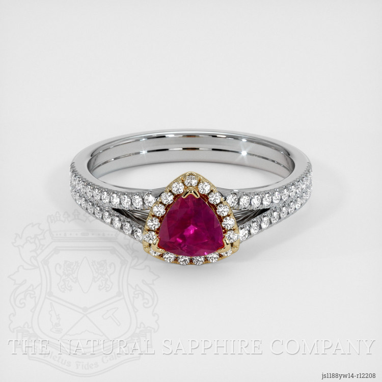 The ring features a beautiful, transparent 0.51 carat trillion shape pinkish red ruby with the dimensions of 5.09 x 5.06 x 2.90 mm and a trillion cut. It has a clarity grade of very slightly included (evaluated at eye level), vivid color saturation, and an excellent polish. The origin of this ruby is Burma (Myanmar).