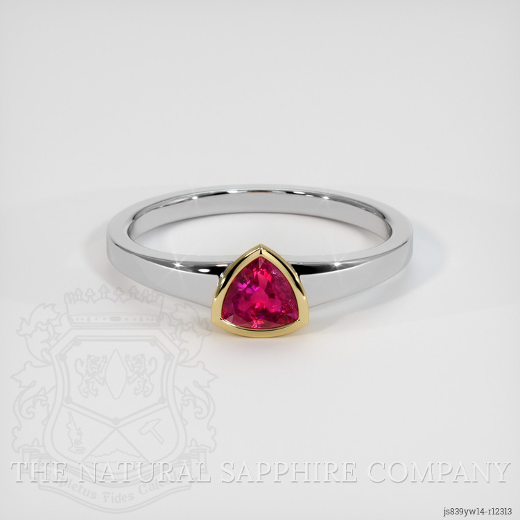 The ring features a beautiful transparent 0.51 carat trillion shape pinkish red ruby with dimensions of 5.01 x 5.00 x 2.73 mm and a trillion cut. The ruby has a clarity grade of very slightly included (evaluated at eye level), vivid color saturation, and an excellent polish. The origin of this ruby is Burma (Myanmar). The exquisite trillion cut faceting style captures and reflects light brilliantly, enhancing the inherent vividness of the gemstone’s color. The shades of pinkish red interlace beautifully against the chic design, making it a central piece of elegance and fascination.
