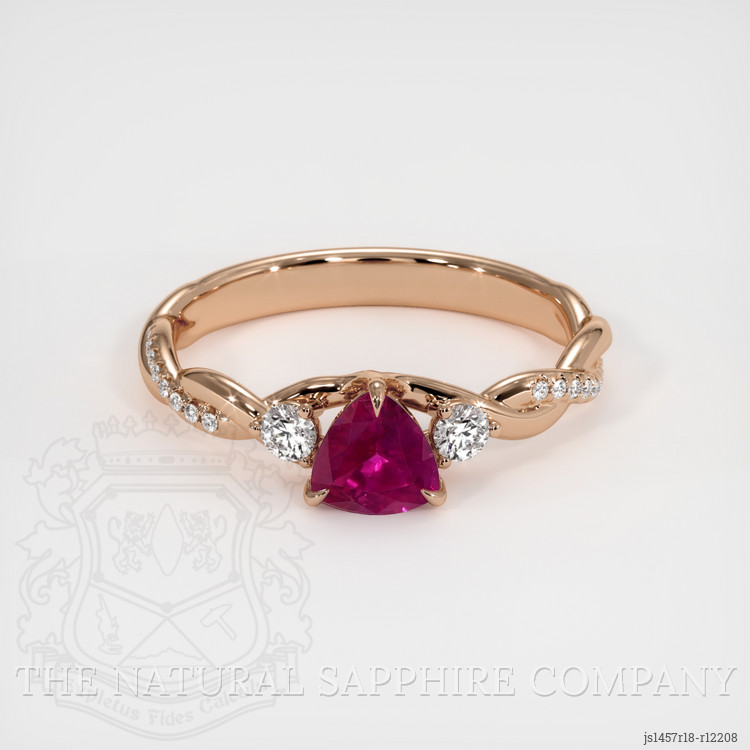 The ring features a beautiful, transparent 0.51 carat trillion shape pinkish red ruby with the dimensions of 5.09 x 5.06 x 2.90 mm and a trillion cut. It has a clarity grade of very slightly included (evaluated at eye level), vivid color saturation, and an excellent polish. The origin of this ruby is Burma (Myanmar).