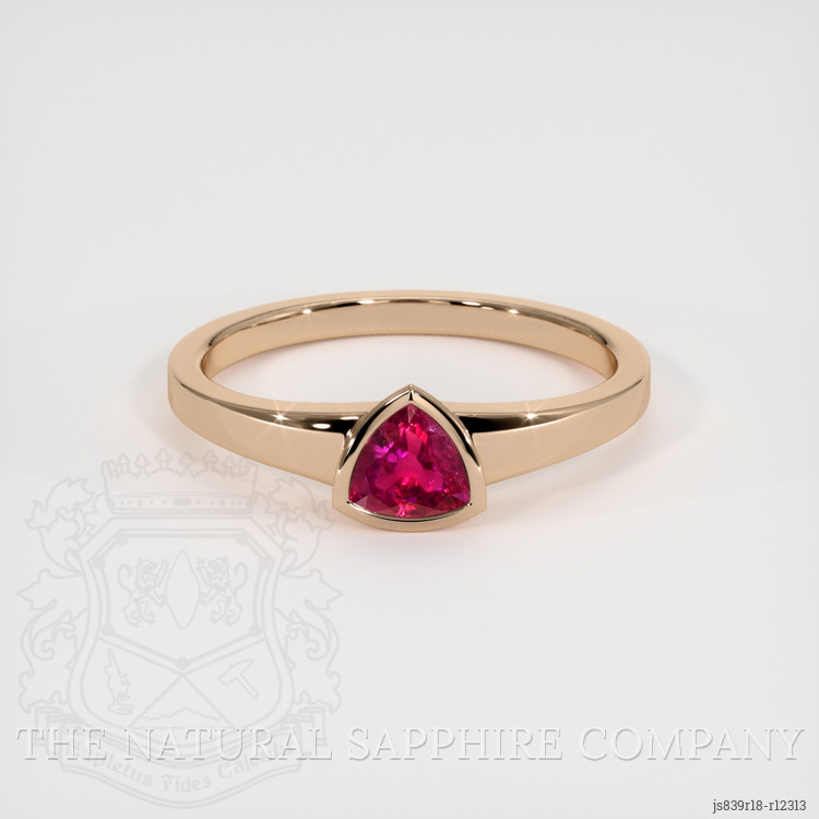 This exquisite ring is a testament to unparalleled craftsmanship and timeless elegance. The centerpiece is a magnificent, transparent 0.51 carat trillion-shaped pinkish-red ruby. The dimensions of the ruby are 5.01 x 5.00 x 2.73 mm, showcasing a trillion cut that enhances its striking appearance. The ruby is of exceptional quality with a clarity grade of very slightly included when evaluated at eye level, vivid color saturation, and an excellent polish. Originating from the legendary gemstone mines of Burma (Myanmar), this ruby evokes a sense of history and prestige.