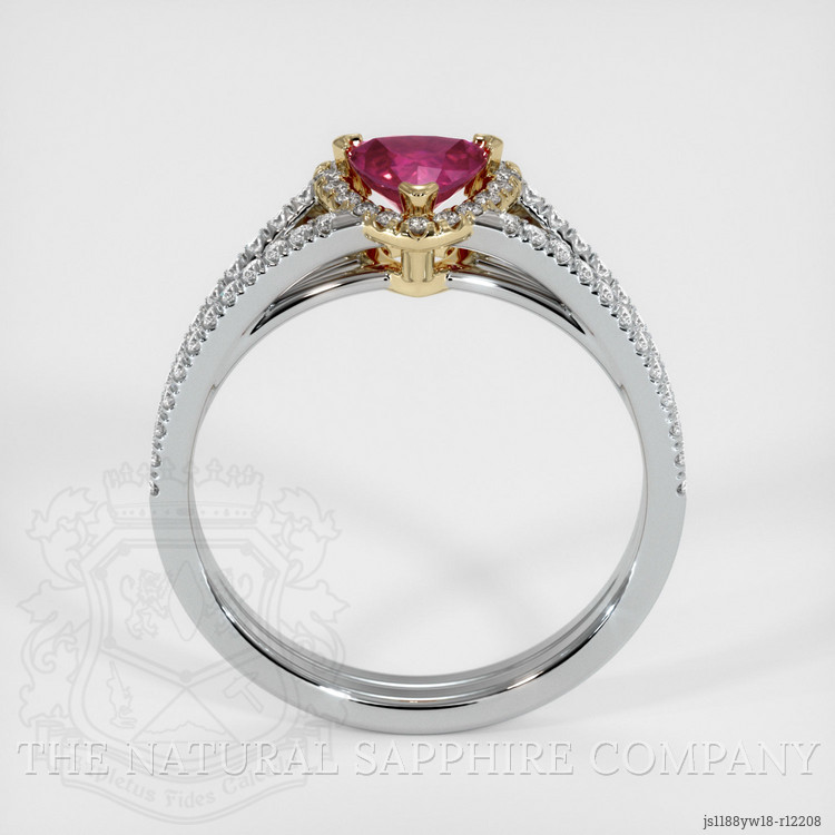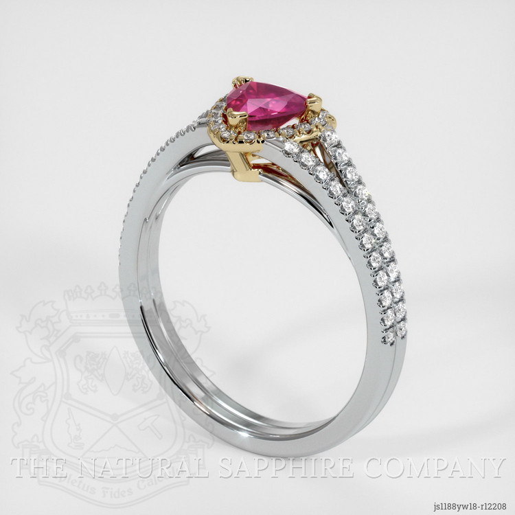 The ring features a beautiful, transparent 0.51 carat trillion shape pinkish red ruby with the dimensions of 5.09 x 5.06 x 2.90 mm and a trillion cut. It has a clarity grade of very slightly included (evaluated at eye level), vivid color saturation, and an excellent polish. The origin of this ruby is Burma (Myanmar).