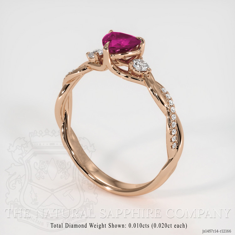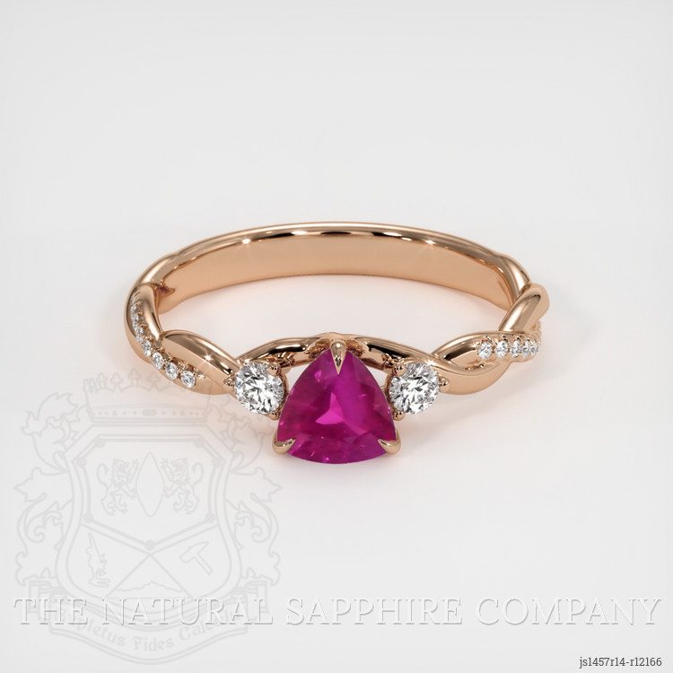 The ring features a beautiful, transparent 0.58 carat trillion shape pinkish red ruby with the dimensions of 5.18 x 5.19 x 3.15 mm and a trillion cut. It has a clarity grade of very slightly included (evaluated at eye level), vivid color saturation, and an excellent polish. The origin of this ruby is Burma (Myanmar).