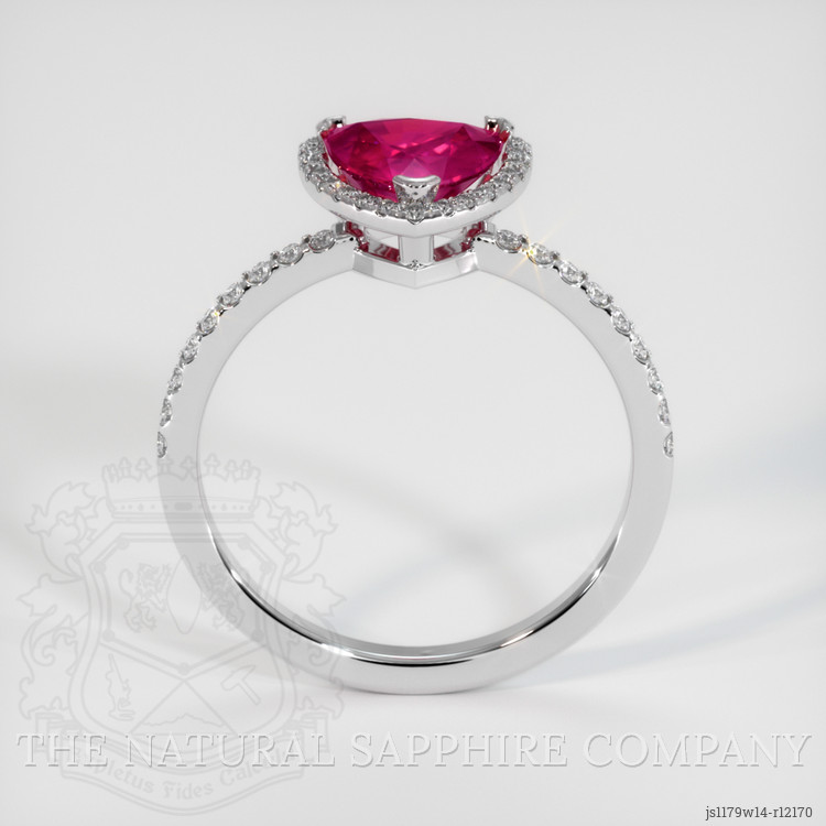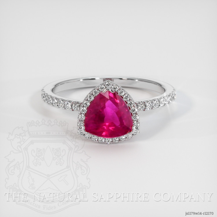 The ring features a beautiful, transparent 1.16 carat trillion shape pinkish red ruby with the dimensions of 6.92 x 6.84 x 3.50 mm and a trillion cut. It has a clarity grade of very slightly included (evaluated at eye level), vivid color saturation, and an excellent polish. The origin of this ruby is Burma (Myanmar).