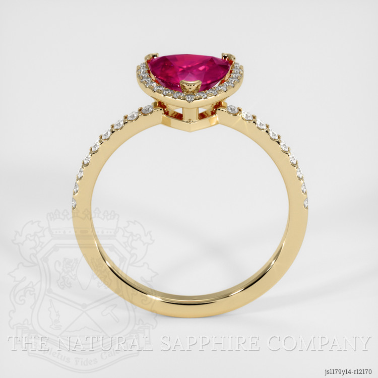 The ring features a beautiful, transparent 1.16 carat trillion shape pinkish red ruby with the dimensions of 6.92 x 6.84 x 3.50 mm and a trillion cut. It has a clarity grade of very slightly included (evaluated at eye level), vivid color saturation, and an excellent polish. The origin of this ruby is Burma (Myanmar).