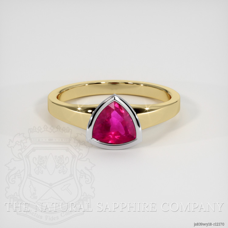 The ring features a beautiful transparent 1.16 carat trillion-shaped pinkish red ruby with dimensions of 6.92 x 6.84 x 3.50 mm and a trillion cut. It has a clarity grade of very slightly included (evaluated at eye level), vivid color saturation, and an excellent polish. The origin of this ruby is Burma (Myanmar). The faceting style highlights the natural brilliance and fire of the ruby, ensuring it captures and refracts light beautifully from every angle. The craftsmanship techniques used in cutting the ruby and setting it into the ring maintain the symmetry and proportions recommended for maximizing its visual appeal.