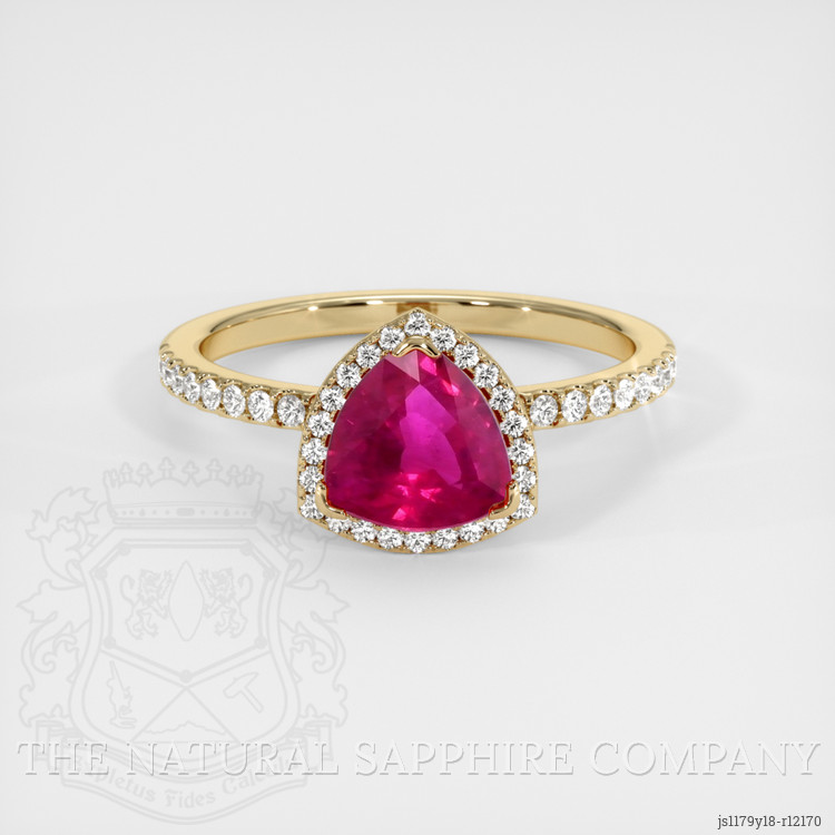 The ring features a beautiful, transparent 1.16 carat trillion shape pinkish red ruby with the dimensions of 6.92 x 6.84 x 3.50 mm and a trillion cut. It has a clarity grade of very slightly included (evaluated at eye level), vivid color saturation, and an excellent polish. The origin of this ruby is Burma (Myanmar).
