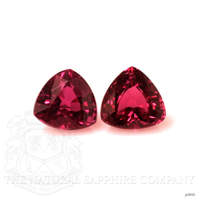 The earrings feature a beautiful, transparent pair of rubies that are 1.21 total carat weight. They are trillion shape red rubies, with the dimensions of 4.80 x 4.80 x 1.00 mm and are trillion cut, have a clarity grade of eye clean (evaluated at eye level), intense color saturation, and an excellent polish. The origin of this pair of rubies is Mozambique.