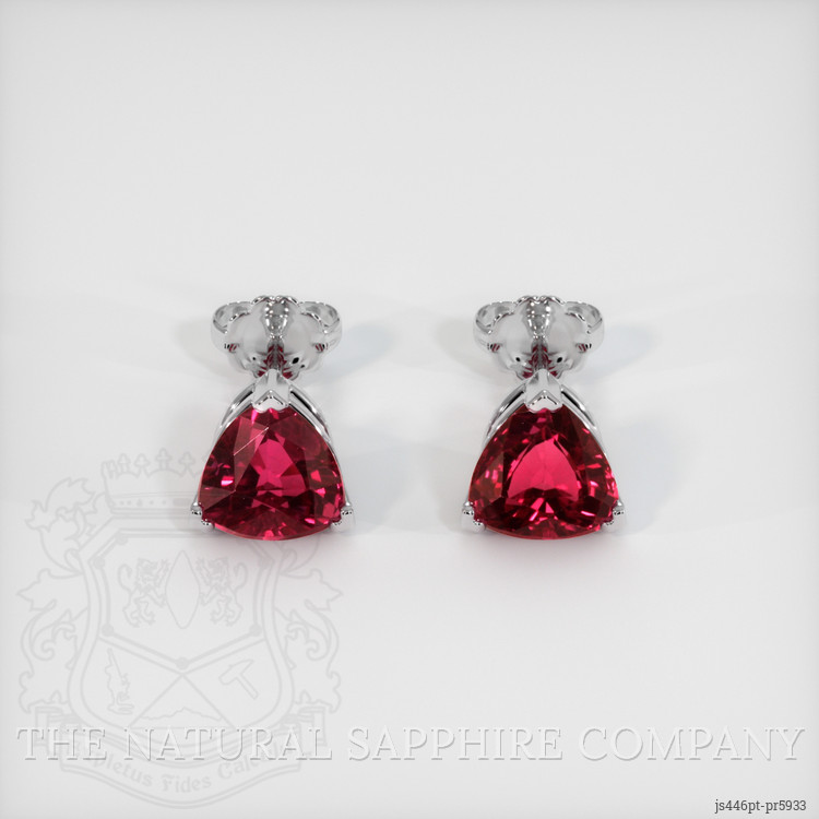 The earrings feature a beautiful, transparent pair of rubies that are 1.21 total carat weight. They are trillion shape red rubies, with the dimensions of 4.80 x 4.80 x 1.00 mm and are trillion cut, have a clarity grade of eye clean (evaluated at eye level), intense color saturation, and an excellent polish. The origin of this pair of rubies is Mozambique.