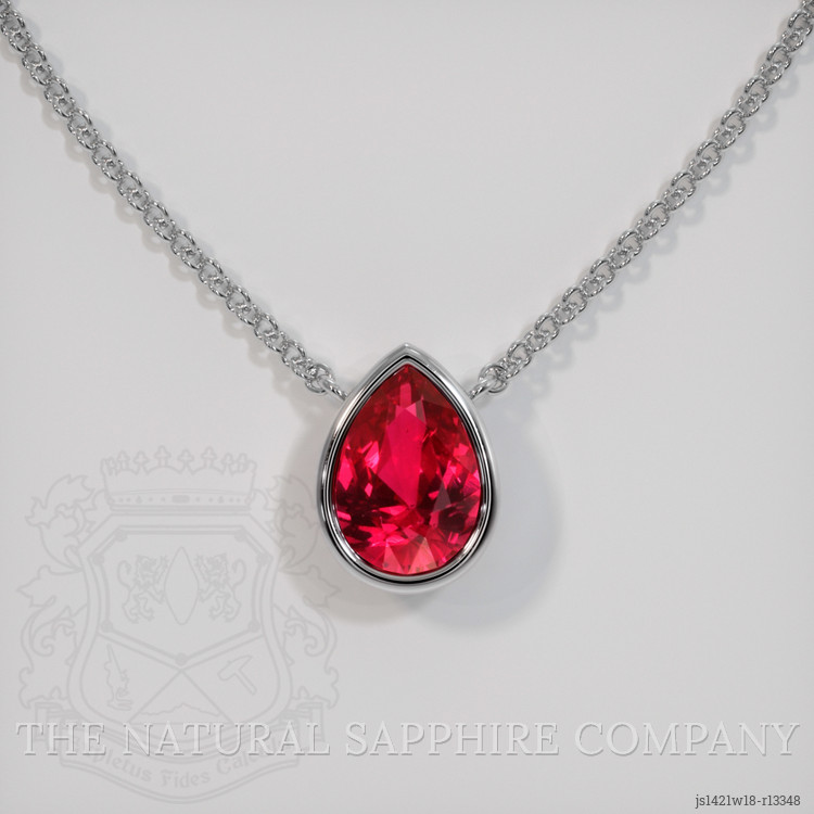 The necklace features a beautiful, transparent GIA certified Purplish Red 1.57 carat pear shape purplish red ruby with the dimensions of 8.22 x 5.86 x 4.43 mm and a mixed brilliant cut. It has a clarity grade of very slightly included (evaluated at eye level), intense color saturation, and an excellent polish. The origin of this ruby is Mozambique.