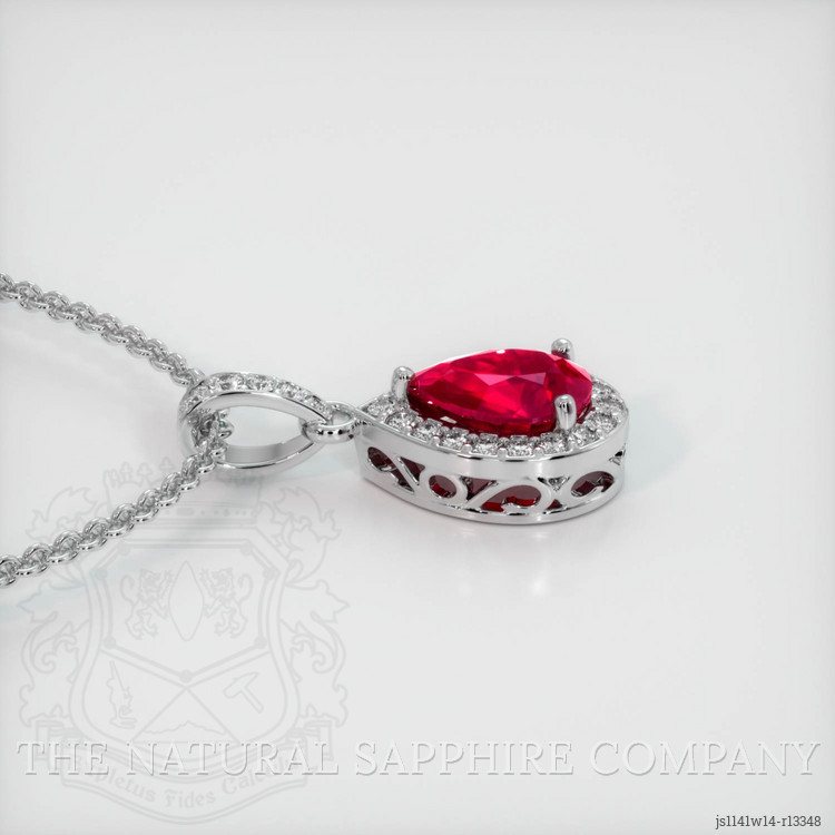 The pendant features a beautiful, transparent GIA certified Purplish Red 1.57 carat pear shape purplish red ruby with the dimensions of 8.22 x 5.86 x 4.43 mm and a mixed brilliant cut. It has a clarity grade of very slightly included (evaluated at eye level), intense color saturation, and an excellent polish. Enhancement: no enhancement. The origin of this ruby is Mozambique.