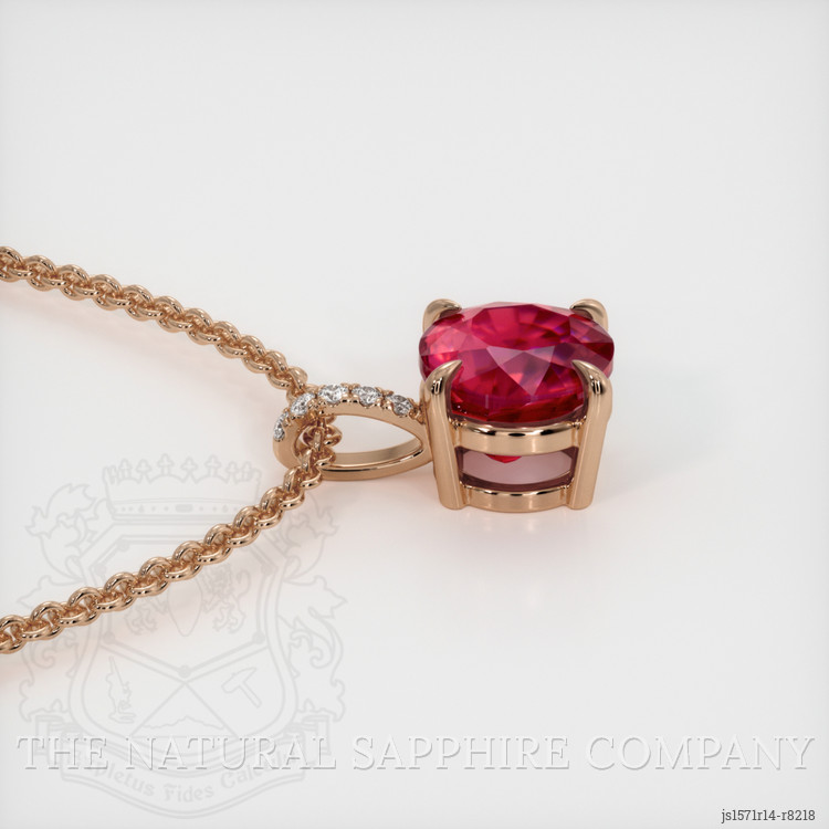 The pendant features a beautiful, transparent 1.51 carat round shape purplish red ruby with the dimensions of 6.25 x 6.18 x 4.90 mm and a mixed brilliant cut. It has a clarity grade of very slightly included (evaluated at eye level), vivid color saturation, and an excellent polish. The origin of this ruby is Burma (Myanmar).