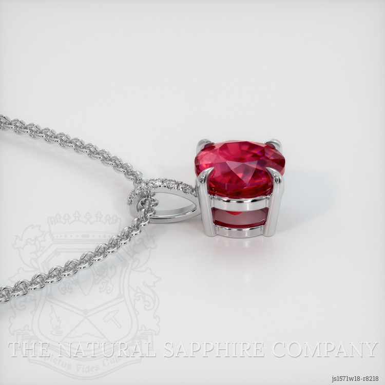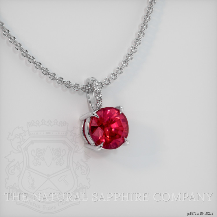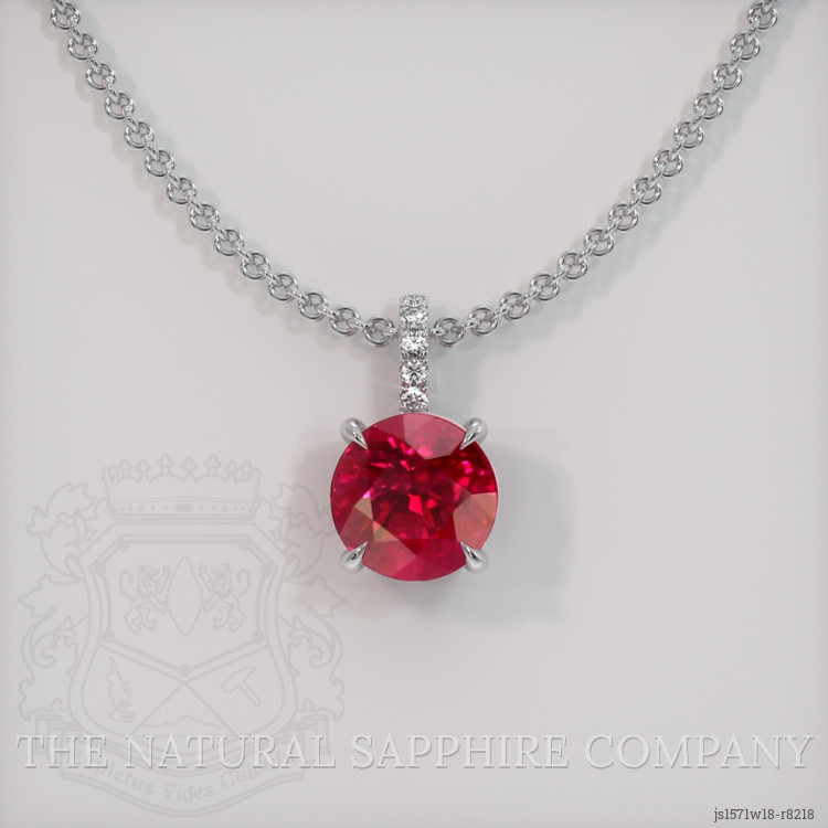 The pendant features a beautiful, transparent 1.51 carat round shape purplish red ruby with the dimensions of 6.25 x 6.18 x 4.90 mm and a mixed brilliant cut. It has a clarity grade of very slightly included (evaluated at eye level), vivid color saturation, and an excellent polish. The origin of this ruby is Burma (Myanmar).