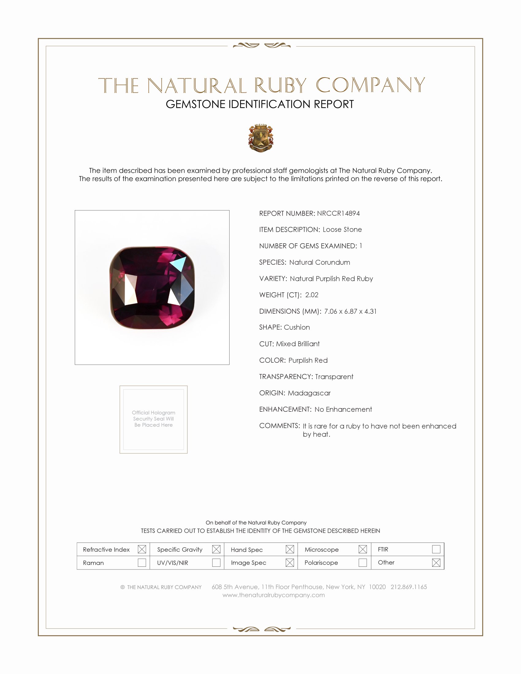 The ruby's deep purplish red hue is enriched by its dark color saturation, a tone that speaks of mystery and sophistication. The excellence in polish results in a surface that is smooth and lustrous, adding to the gem's sparkle and allure. What distinguishes this ruby from others on the market is its natural, untreated state. Free from enhancement, this gemstone is pure in its form, allowing you to enjoy the ruby's innate beauty as it was created by nature. This characteristic, combined with its arresting color, makes it an exceptional choice for the discerning connoisseur who values authenticity and rarity.