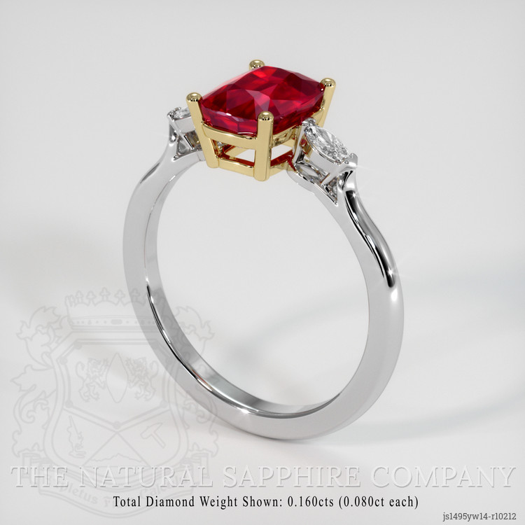 The intense color saturation of this Mozambican ruby is truly unparalleled. It exudes a richness that is both rare and desirable, ensuring it becomes the focal point of any jewelry collection. Expertly polished to an excellent finish, this gemstone captures and reflects light in the most enchanting way. Set in a combination of 18K yellow gold and 18K white gold, the ruby is embraced by a modern yet timeless design, amplifying its regal charm. Adding to its allure, marquise-shaped white diamonds flank the central stone, collectively weighing approximately 0.16 carats. These diamonds possess a clarity grading of Very Slightly Included (VS1, VS2) and a color grade of E, aligning perfectly with the standards of purity and brightness.