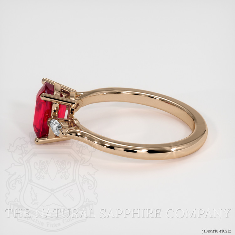 Adorning either side of the ruby are finely chosen white marquise-shaped diamonds, with a combined weight of approximately 0.16 carats. Their clarity, evaluated at very slightly included (VS1, VS2), and their pristine E color grade, ensure that they complement and highlight the central gemstone magnificently. Set in 18K Rose Gold, the metal's subtle warmth envelops each stone, radiating an aura of sophistication and earthly elegance.