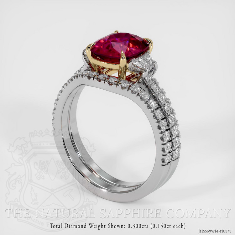 The ring features a beautiful, transparent 2.92 carat cushion shape purplish red ruby with the dimensions of 8.26 x 7.33 x 4.70 mm and a mixed brilliant cut. It has a clarity grade of eye clean (evaluated at eye level), vivid color saturation, and an excellent polish. The origin of this ruby is Burma (Myanmar).