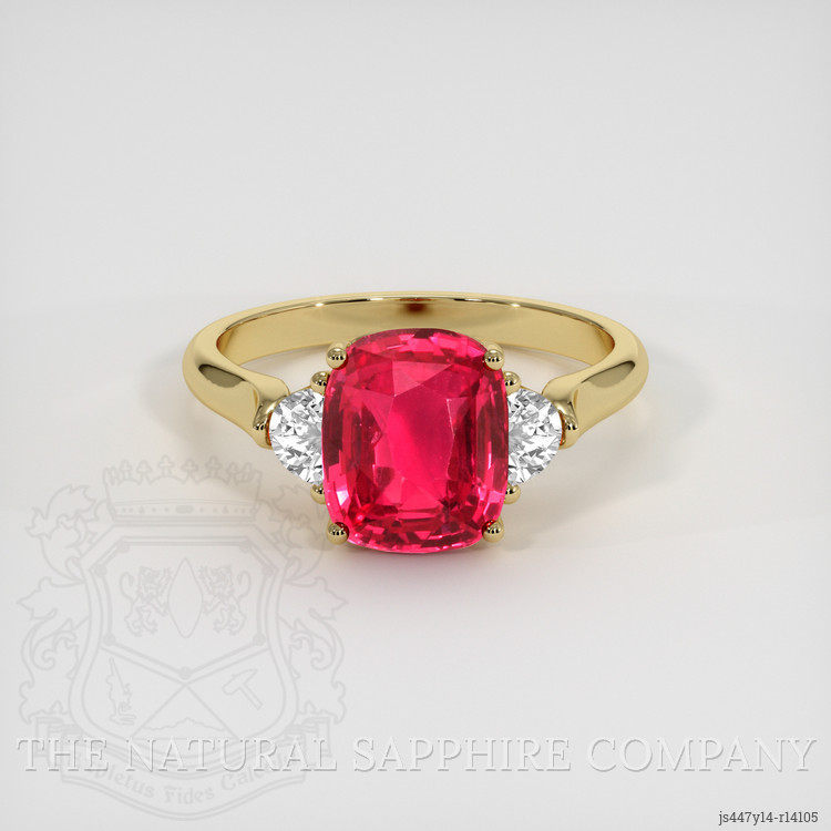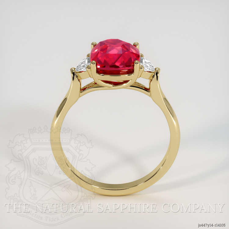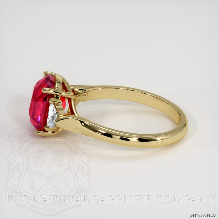 Flanking the ruby are two natural half moon diamonds, with a combined weight of approximately 0.30 carats, clarity grades Very Slightly Included, VS1 and VS2, and color grade E. These half moon diamonds are positioned to act as a compositional frame, their tapered shapes following the shoulder lines and directing focus toward the central cushion ruby. The entire mounting is executed in 18K yellow gold, a metal choice that provides warm contrast to the purplish red tone and highlights the vivid saturation of the ruby. The shoulders are subtly tapered, keeping the silhouette refined while supporting the center stone without competing visually, and the low profile of the gallery provides secure elevation with minimal obstruction to light. This ring, offered by The Natural Ruby Company, emphasizes gem quality and proportion, using measured design choices to showcase the ruby as the definitive focal point.