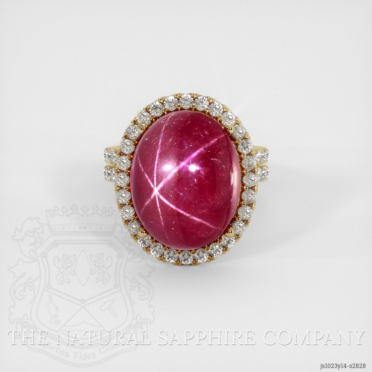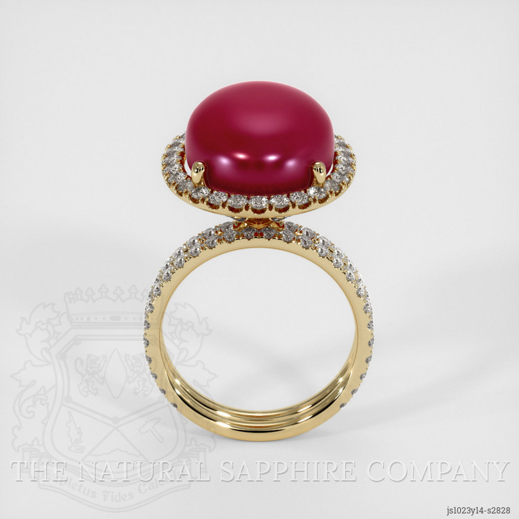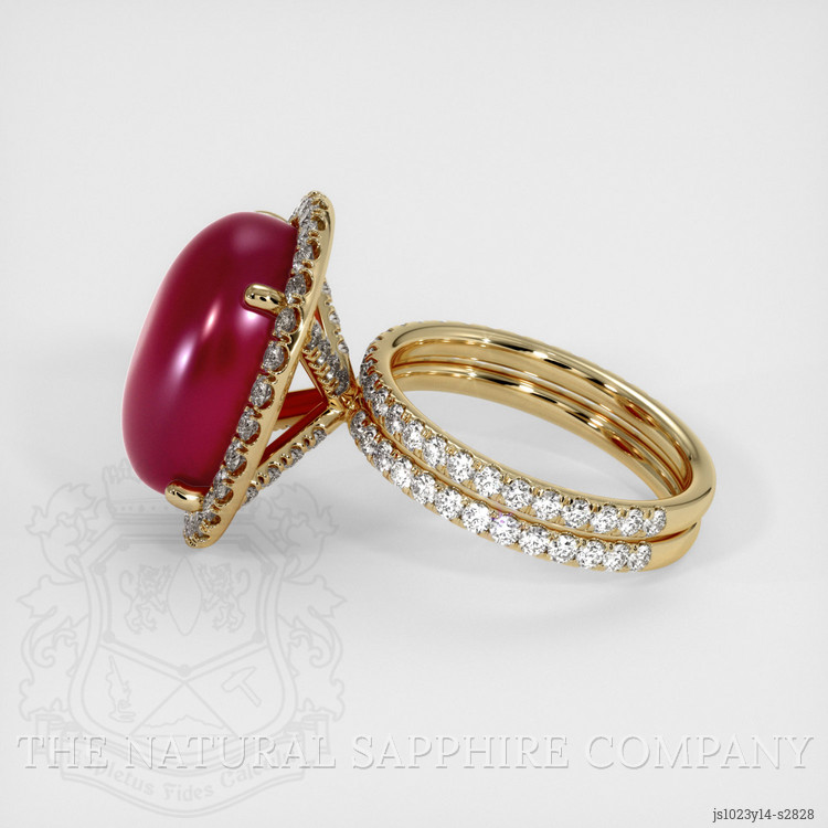 The ring features a beautiful, opaque GAL certified Purplish Red 17.55 carat oval shape purplish red ruby with the dimensions of 16.74 x 13.30 x 6.74 mm and a cabochon cut. It has a clarity grade of very slightly included (evaluated at eye level), vivid color saturation, and an excellent polish. The origin of this ruby is Burma (Myanmar).
