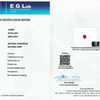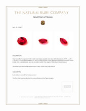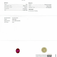 The ring features a beautiful, transparent GIA certified Red 2.00 carat oval shape purplish red ruby with the dimensions of 7.91 x 6.49 x 4.45 mm and a mixed brilliant cut. It has a clarity grade of very slightly included (evaluated at eye level), vivid color saturation, and an excellent polish. The origin of this ruby is Mozambique.