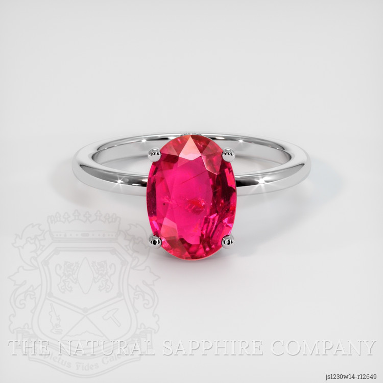 The ring features a beautiful, transparent 2.10 carat oval shape purplish red ruby with the dimensions of 9.41 x 6.82 x 3.47 mm and a mixed brilliant cut. It has a clarity grade of very slightly included (evaluated at eye level), intense color saturation, and an excellent polish. Enhancement: no enhancement. The origin of this ruby is Mozambique.