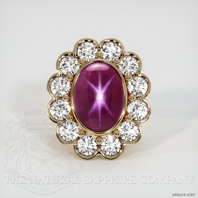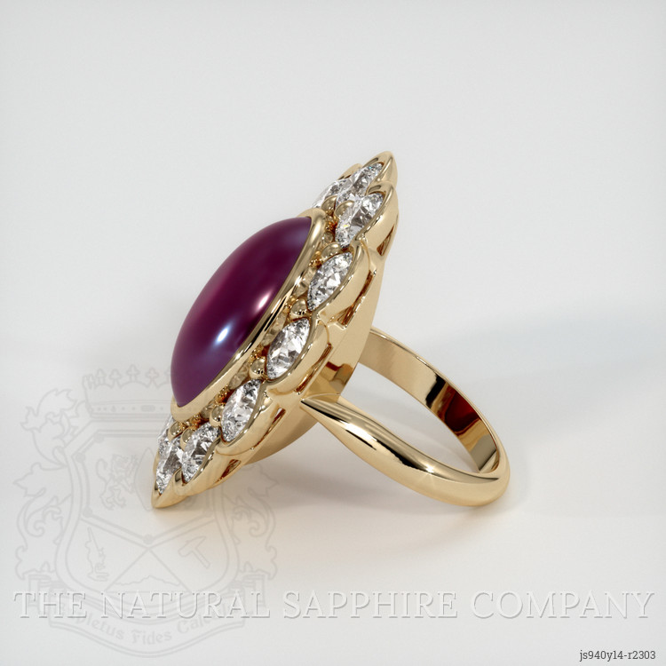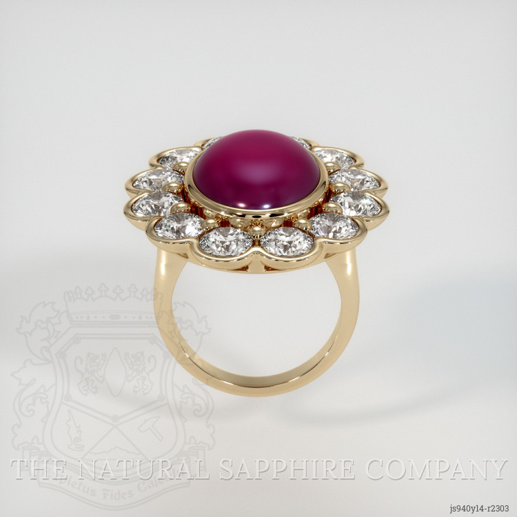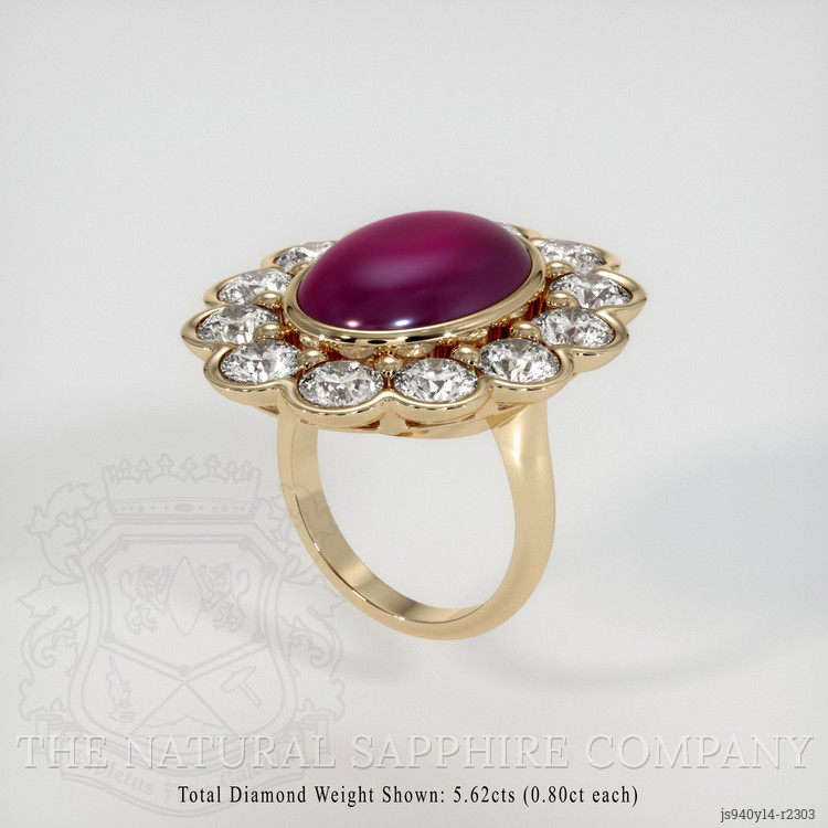 The ring features a beautiful, opaque 24.98 carat oval shape purplish red ruby with the dimensions of 18.93 x 13.50 x 8.07 mm and a cabochon cut. It has a clarity grade of slightly included (evaluated at eye level), vivid color saturation, and an excellent polish. The origin of this ruby is Vietnam.