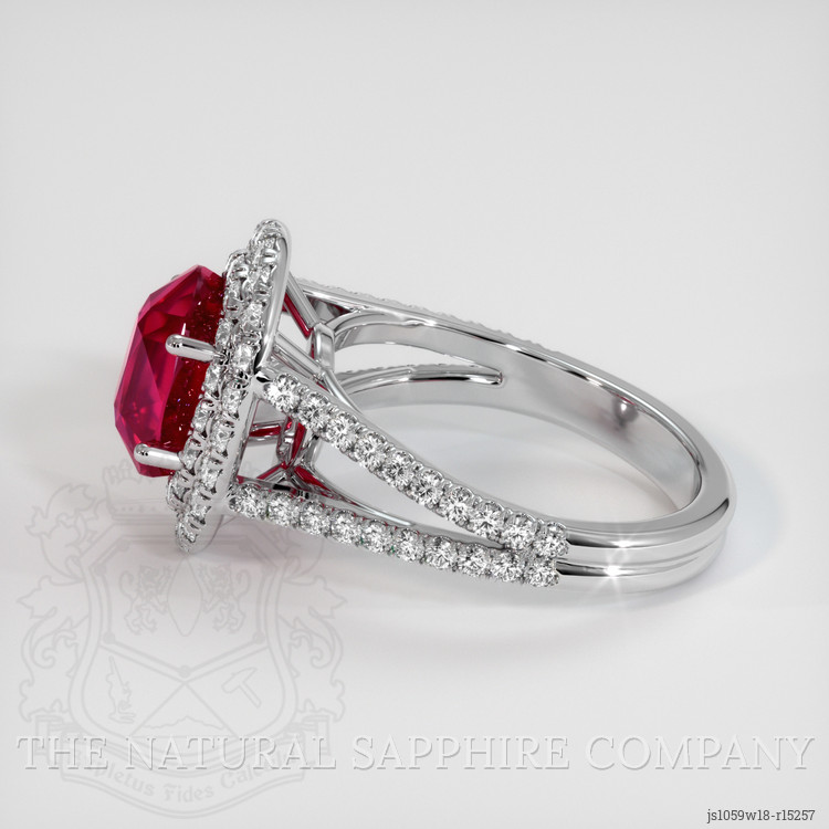 The setting elevates the ruby and defines the piece as an heirloom worthy engagement or wedding ring. Surrounding the center gem is a halo of white round natural diamonds, complemented by additional white round natural diamonds along a split shank, together creating a luminous frame that intensifies the ruby color. The halo and outer diamonds weigh approximately 0.756 carats with clarity VS and color F and G, while the pavé set stones on the shank add approximately 0.594 carats, also graded VS clarity and F and G color, selected to deliver bright contrast and consistent sparkle. All of these diamonds are natural, precision matched for harmony, and they are set entirely in 18K white gold, a metal choice that enhances the cool brilliance of the diamonds while allowing the warm purplish red ruby to become the focal point. The setting offers both protection for the ruby and an elegant silhouette that reads effortlessly as a modern classic.