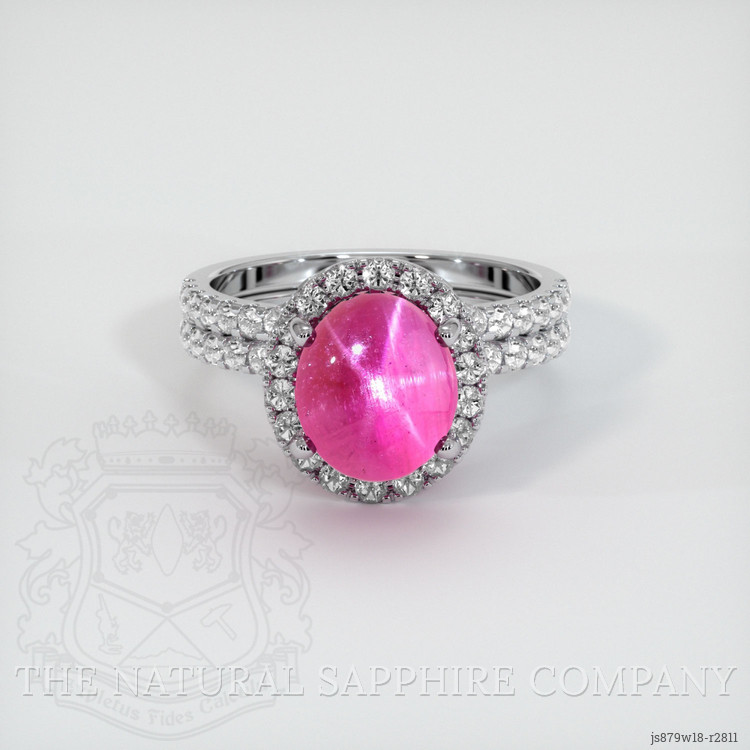 The ring features a beautiful, translucent GIA certified Purplish Red 7.60 carat oval shape purplish red ruby with the dimensions of 10.11 x 8.70 x 8.11 mm and a cabochon cut. It has a clarity grade of very slightly included (evaluated at eye level), intense color saturation, and an excellent polish. The origin of this ruby is Ceylon (Sri Lanka).