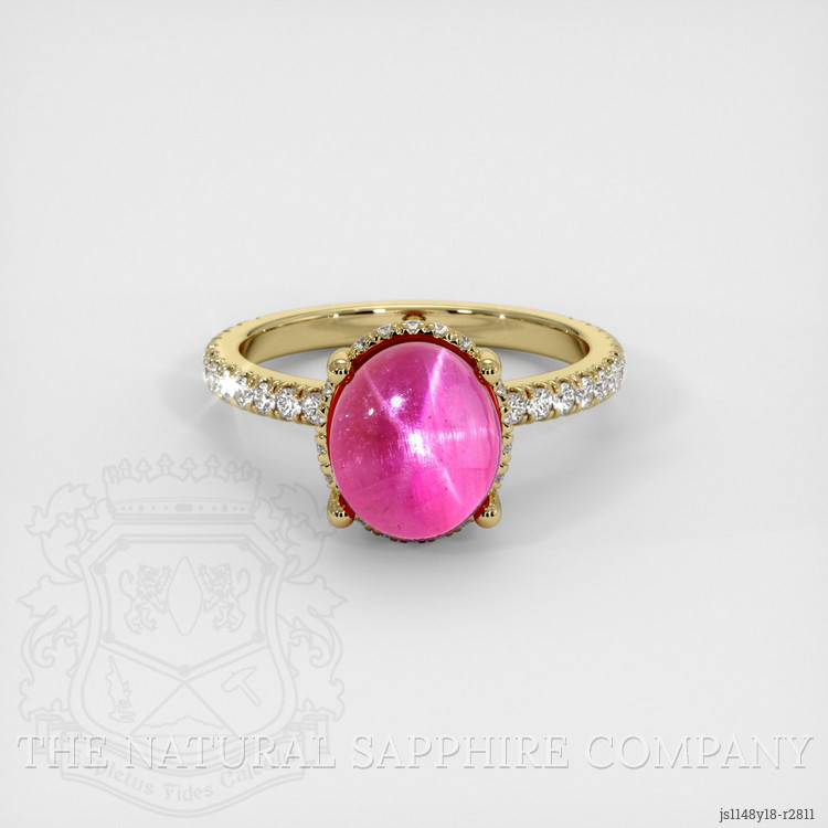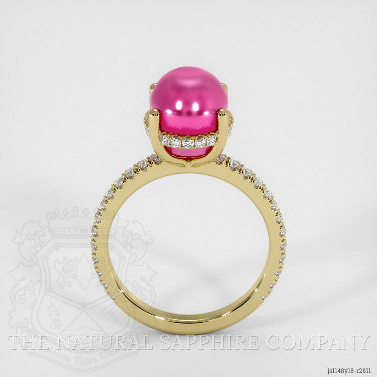 The ring features a beautiful, translucent GIA certified Purplish Red 7.60 carat oval shape purplish red ruby with the dimensions of 10.11 x 8.70 x 8.11 mm and a cabochon cut. It has a clarity grade of very slightly included (evaluated at eye level), intense color saturation, and an excellent polish. The origin of this ruby is Ceylon (Sri Lanka).