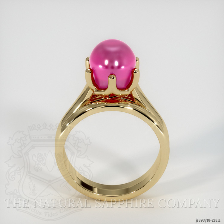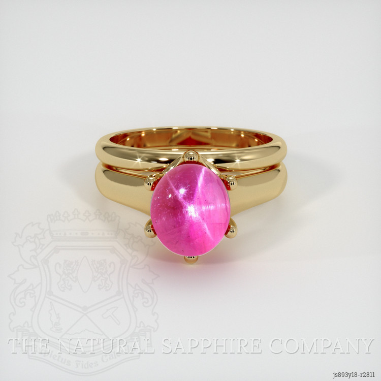 The ring features a beautiful, translucent GIA certified Purplish Red 7.60 carat oval shape purplish red ruby with the dimensions of 10.11 x 8.70 x 8.11 mm and a cabochon cut. It has a clarity grade of very slightly included (evaluated at eye level), intense color saturation, and an excellent polish. The origin of this ruby is Ceylon (Sri Lanka).