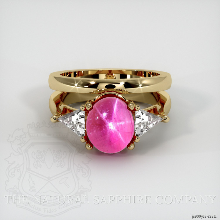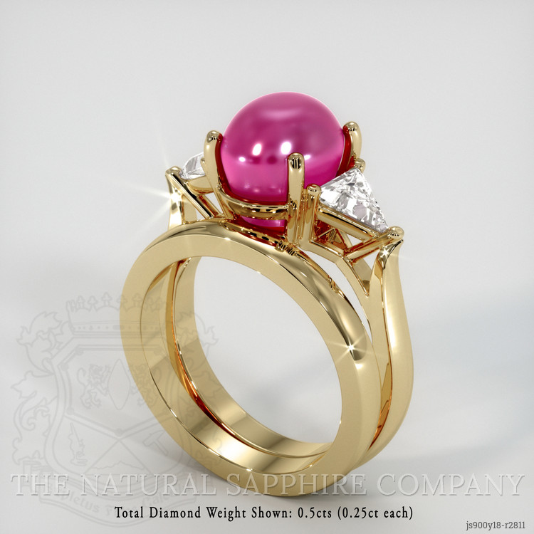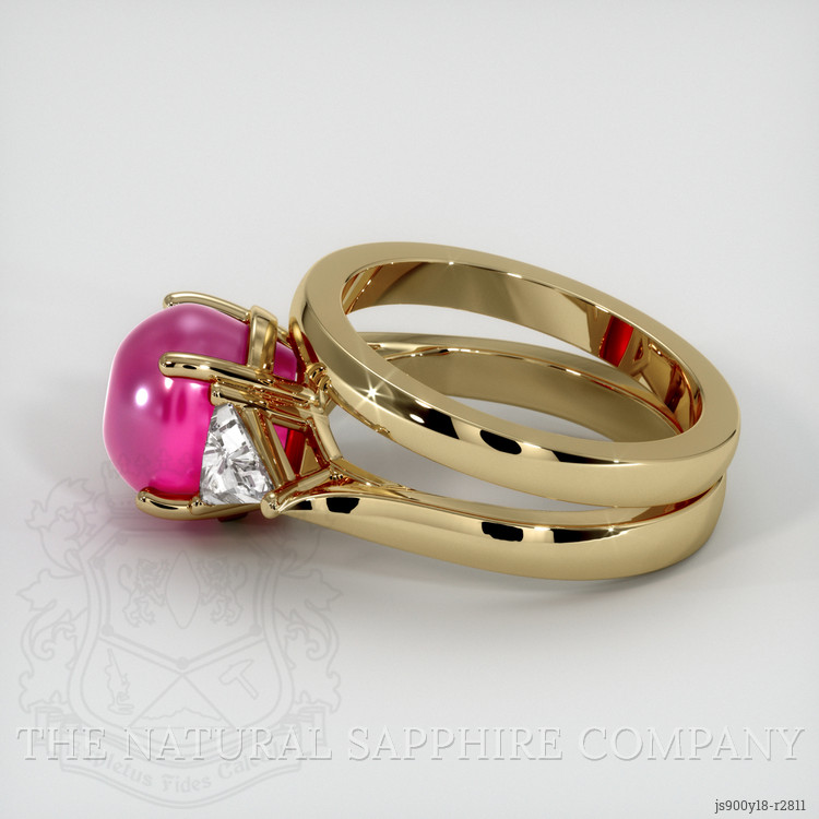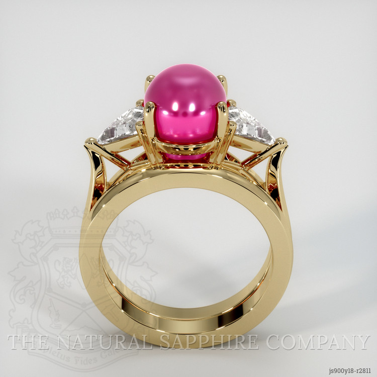 The ring features a beautiful, translucent GIA certified Purplish Red 7.60 carat oval shape purplish red ruby with the dimensions of 10.11 x 8.70 x 8.11 mm and a cabochon cut. It has a clarity grade of very slightly included (evaluated at eye level), intense color saturation, and an excellent polish. The origin of this ruby is Ceylon (Sri Lanka).