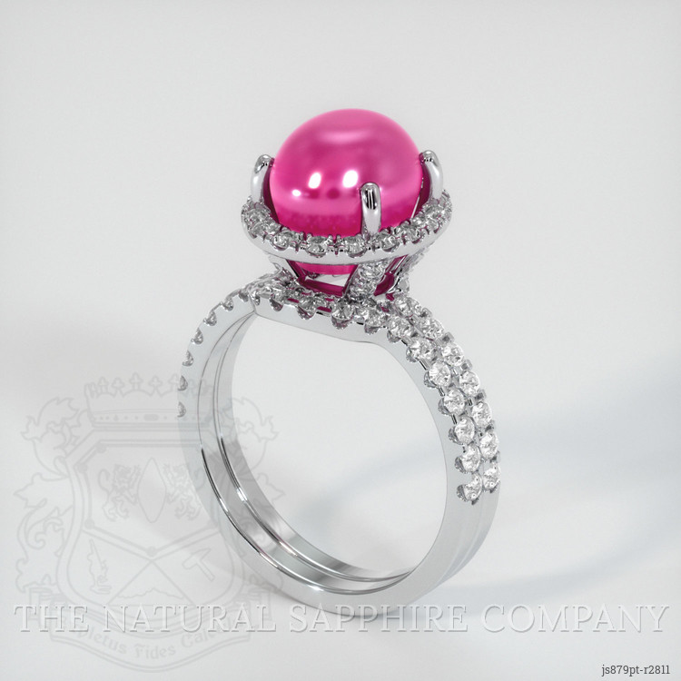 The ring features a beautiful, translucent GIA certified Purplish Red 7.60 carat oval shape purplish red ruby with the dimensions of 10.11 x 8.70 x 8.11 mm and a cabochon cut. It has a clarity grade of very slightly included (evaluated at eye level), intense color saturation, and an excellent polish. The origin of this ruby is Ceylon (Sri Lanka).