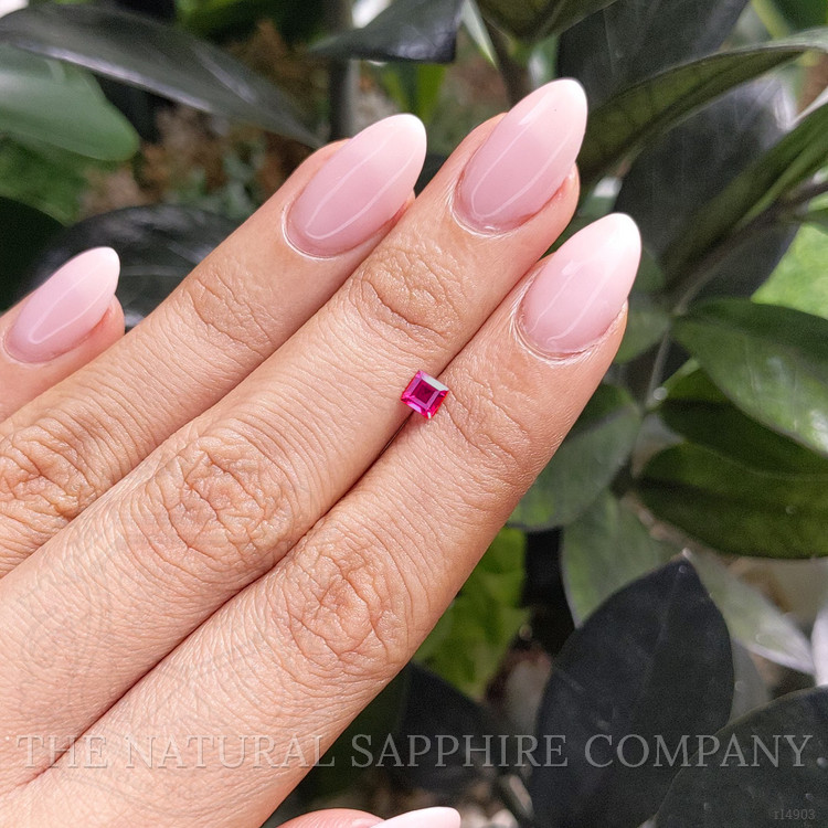 Introducing an exquisite piece of craftsmanship by The Natural Ruby Company, this ring showcases a truly remarkable purplish red ruby at its heart. With a weight of 0.39 carats, the gemstone is beautifully cut in a princess shape. The dimensions are delicately proportioned at 3.92 x 3.84 x 2.66 mm, ensuring that it sits elegantly upon any finger. The princess cut of the ruby enhances its vivid color saturation, resulting in a captivating spectacle of light and hue. Evaluated at eye level, the ruby possesses a clarity grade of very slightly included, offering an exceptional transparency that highlights its natural beauty. This gem remains unenhanced, a testament to the skilled artistry involved in sourcing rubies from the rich mines of Madagascar.