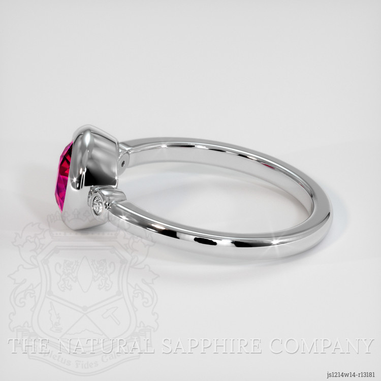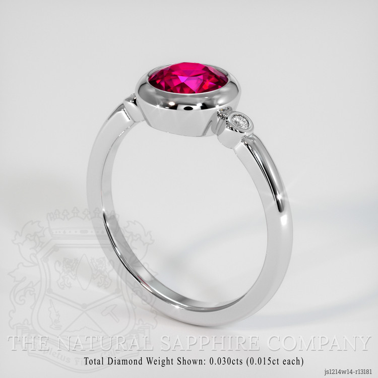 Set amidst this deep, alluring ruby are white round shaped diamonds that introduce an additional layer of brilliance and sophistication. Each diamond weighs approximately 0.03 carats and is classified under the Very Slightly Included (VS1, VS2) clarity category, indicating inclusions that are hardly visible without magnification. The diamonds boast a color grade of F, meaning they are nearly colorless, allowing them to complement the rich hue of the ruby without distraction. The contrast between the sumptuous ruby and the sparkling diamonds creates a dazzling effect that captures light from every angle.