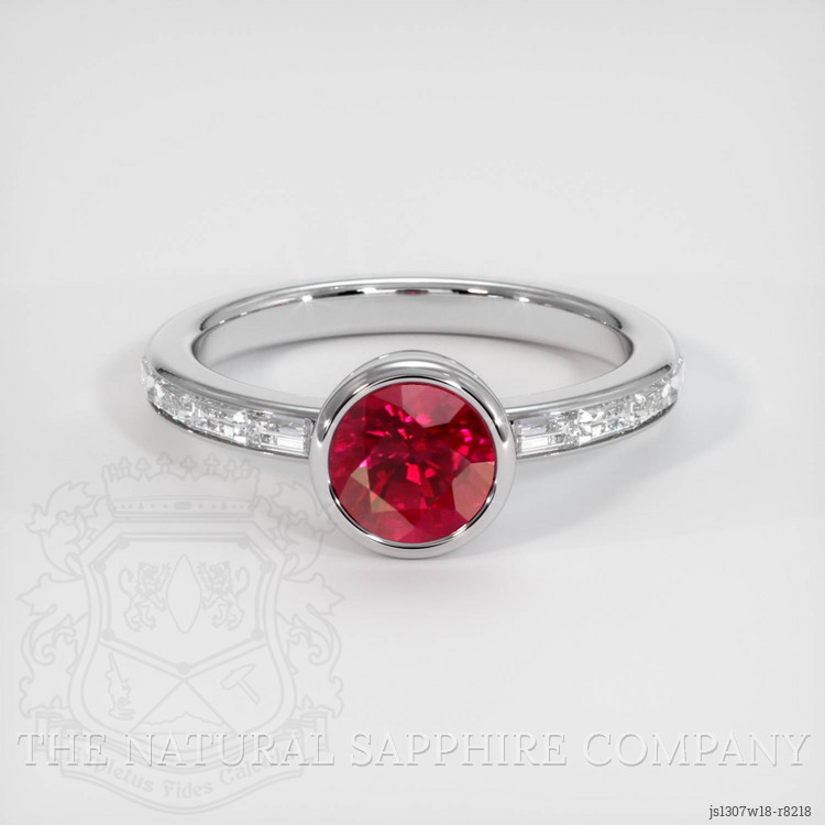 The ring features a beautiful, transparent 1.51 carat round shape purplish red ruby with the dimensions of 6.25 x 6.18 x 4.90 mm and a mixed brilliant cut. It has a clarity grade of very slightly included (evaluated at eye level), vivid color saturation, and an excellent polish. The origin of this ruby is Burma (Myanmar).